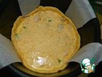 Тесто выложить в чашу мультиварки, формируя бортики. Выложить начинку. Для легкого извлечения готового пирога я сделала полоски из бумаги для выпечки. |