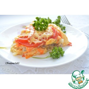 Последний слой - помидоры, и сверху обильно посыпаем сыром. |