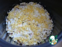 Следующий слой - лук, приправляем майонезом, и сверху слегка посыпаем сыром. |