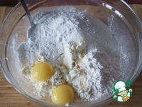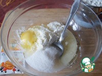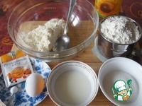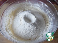 Очень тщательно вымешать. Муку смешать с разрыхлителем. Просеять половину смеси в творожную массу и хорошо перемешать. |