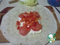 7. Выложить перец и помидор на тортилью, слегка поперчить. |