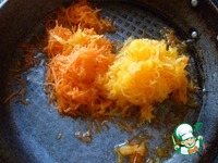 Делаем зажарку. Морковь и тыкву натираем на мелкой терке. На сковороду наливаем растительное масло и обжариваем овощи. |
