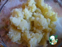 Картофель слить, потолочь. Для лепешек я взяла полную 0.5 л банку пюре. |