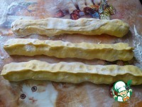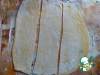 Делим тесто на части. Каждую часть раскатать, но не очень тонко, чтобы лепешки не порвались. Разрезать на полосы. |