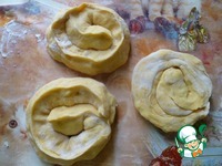 Скручиваем в спираль. Защипнуть концы, чтобы не раскрутилось, и слегка примять скалкой. |