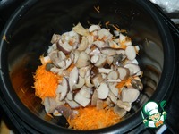 Включить режим "Жарка" 20 минут и сложить в чашу нарезанный лук, тертую морковь и грибы. |