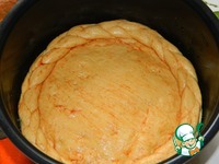 Половину теста раскатать и выложить на дно чаши, формируя бортики. Выложить начинку. |