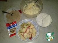 Готовим продукты к выпечке. Яблоко порезать тонкими ломтиками, сахар смешать с корицей, в муку добавить разрыхлитель, масло размягчить и перемешать с творогом |