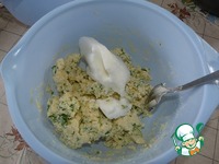 Порезать зелень. Чеснок мелко порубить. Натереть на терке сыр. Затем зелень, чеснок и сыр (не весь!!!, оставить примерно 30 г. для присыпки верха) добавить в массу и хорошо перемешать. |