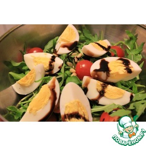 Яйца заранее отварить «вкрутую» и остудить. На дно порционной тарелки положите листья рукколы, на них выложите тунца из банки по центру тарелки, добавьте оливковое масло. Свежие помидоры порезать пополам и затем полукольцами уложить вокруг тунца или помидоры черри порезать поподам, сверху помидоры приправить соусом песто. Яйцо порезать на 6 или 8 долек и добавить сверху, посыпать кедровые орехи. По вкусу добавить соль и перец, а так же бальзамико (уксус для более терпкого вкуса или крем для более сладкого). Легкий и изысканный салат готов!