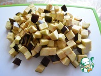 Моем баклажан. Режем небольшими кусочками. Солим 0,5 ч. л., и оставляем на некоторое время. |