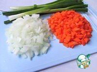 Морковь и репчатый лук очищаем, режем небольшими кубиками. Зеленый лук режем колечками и оставляем для украшения. |