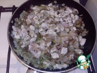 Тем временем нарезам куриное филе на небольшие кусочки и также добавляем в сковороду, добавляем соль, перец, имбирь, базилик |