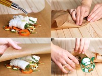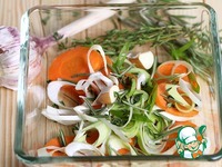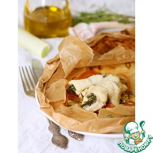 На середину одного выкладываем 1/4 овощной смеси. Берем рыбные филе без кожи, солим и перчим по вкусу, кладем немного укропа и заворачиваем рулеты, чтобы он оказался внутри. Теперь укладываем два рулета на овощную горку и поливаем немного оливковым маслом.