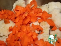 Морковь чищу и режу мелкими кубиками. Добавляю в сковороду. Туда же отправляю цветную капусту. Закрываю крышкой. Жарю, периодически помешивая, 7-8 минут. В это время натираю сыр на мелкой терке. |