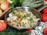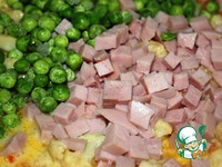Добавляю зеленый горошек и ветчину. По желанию можно добавить мелко нарезанную свежую зелень укропа. Перемешиваю. Держу на огне 2 минуты. |