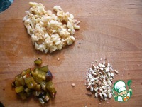 Положить их в другую миску побольше, добавить нарезанные фрукты, орехи, сливочный сыр и варёную сгущёнку. Хорошо перемешать до однородности |