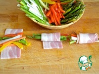2. Чуть растянуть кусочек бекона, проведя по нему ножом, и разрезать его пополам. Положить немного овощей на кусочек бекона и завернуть. |