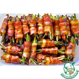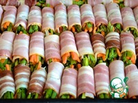 Описание: Очень выигрышное блюдо для фуршета и праздничного стола – оно нравится всем. Хрустящие овощи запекаются в кусочке бекона и соусе из мёда и соевого соуса. Рулетики получаются очень ароматными, аппетитными с необычным пряным вкусом. Они маленькие, на один зубок. Лучше разносить блюдо и предлагать гостям, а не ставить на стол, чтобы попробовали все. Иначе многие могут просто не успеть.