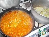Оставить в казане 1/2 капусты, выложить томаты, чеснок и слой фарша. Затем опять капуста... томаты... фарш.. и так 2 раза. добавить томаный сок, воду чтоб только покрывало рис и капусту, накрыть крышкой и оставить на 15- 20 мин на огне до полной готовности и... бонжур мадам! Приятного аппетита!