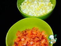 Пока тесто подходит, мелко порубим яйца и нарежем мелкими кубиками лосось. |
