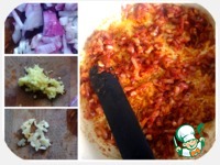 Приготовьте соус. Порежьте лук, чеснок. Натрите имбирь. В сковороду выложите лук, специи, доведите лук до прозрачности. Введите томатную пасту, прожарьте. |