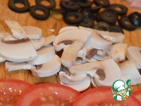 Помидоры и маслины нарезать кружочками, ветчину и грибы на небольшие ломтики. Сыр натереть на мелкой терке. |