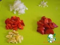 Лук порезать кубиками, чеснок порубить мелко, перец очистить от семян и нарезать полосками, помидоры пополам и дольками. |