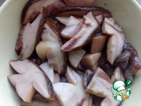 Пока тесто в холодильнике - готовим начинку. Грибы (у меня белые, можно шампиньоны)нарезать пластинками. Я их отварила (10 мин). Несколько грибов отложить для украшения. |