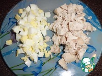 Отварное яйцо и куриное филе нарезаем небольшими кубиками. |