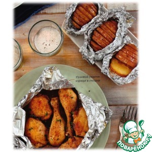 Перемешайте все приправы и соль в чаше, натрите смесью из приправ кусочки курицы и герметично заверните в фольгу.