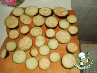 Кружочки баклажан натереть солью и положить на деревянную доску минут на 10-15. |