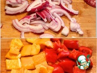 Перец болгарский, лучше если вы будите использовать разные цвета, так сковорода получается ярче. У меня по половине красного и желтого, режим средними кубиками. Лук ялтинский полукольцами. |