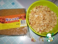 Подготовим халву и арахис. Орехи обжарить и немного измельчить, халву раскрошить, всё смешать. |