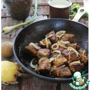 Готовый лук убрать, а в этой же сковороде обжарить кусочки печени до румяной корочки, минуты 3 (По необходимости для жарки добавить растительное масло.) |