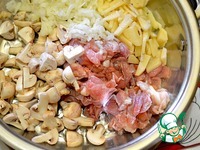 В сковороду добавить растительное масло. Высыпать все подготовленные продукты и обжаривать 5 минут. |