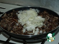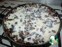 Как грибы с луком будут готовы, не выключая огонь, аккуратно их залить молочно-мучной смесью. Перемешивать не надо. Убавить огонь до минимума, накрыть сковороду крышкой и оставить так минут на 10. |