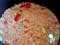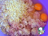 В фарш кладем яйца, хлопья. Пока эта смесь настивается - 5-10 минут, готовим овощную смесь |