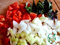 Нарезаем лук, томаты, снимаем листики с веточек базилика, их кладем целыми |