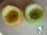 1)У яблок срезать верхушку, так чтоб получилось чуть больше половины. Вырезать сердцевину. Мякоть убрать. толщина стенок у яблок должна быть 1 см. |