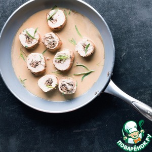 Сверху каждого филе выложить ложку грибной смеси. Свернуть филе рулетом. Нагреть оливковое масло в сковороде и обжарить филе до золотистой корочки с каждой стороны. Оставить готовиться еще 7-10 минут при низкой температуре. Филе достать из сковороды и дать немного остыть. Увеличить температуру нагрева. В сковороду налить белого вина и выпаривать его в течение нескольких минут. Добавить сливки, посолить, поперчить. Рулетики порезать, подавать с винным соусом.