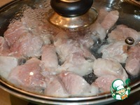 Разогреваем сковороду, выкладываем свинину и слегка присаливаем. Перемешиваем и готовим под крышкой 30 минут, изредка помешивая. |