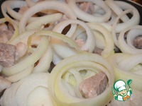 Лук чистим, режем крупными кольцами и отправляем к свинине. Перемешиваем и снова накрываем крышкой, готовим 15 минут. |