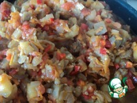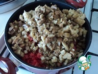 Теперь необходимо ошпарить помидоры кипятком и снять у них кожицу. Теперь, мелко рубим ножом баклажаны и очищенные помидоры, и отправляем в сковороду к остальным овощам. |