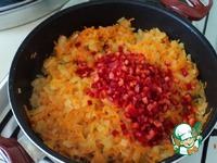 Теперь готовим остальные овощи. Лук и перец нарезаем мелким кубиком, морковь трем на терке. Обжариваем все на растительном масле. |