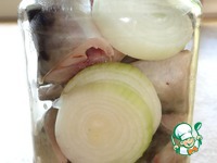 Скумбрию распотрошить, отрезать голову, промыть; Порезать скумбрию на крупные кусочки, лук - кольцами; Рыбу с луком выложить в банку; |