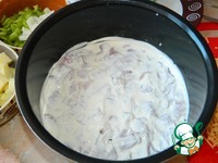 Затем слой из тертой моркови и болгарского перца. Затем снова слой сметаны. Солим, перчим... |