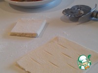Тесто раскатать, нарезать на квадраты, сделать продольные небольшие сквозные прорезы в виде сеточки на каждом квадрате. |