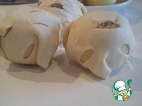 Выложить начинённое яблочко на один подготовленный квадрат из теста, начинкой вниз, обернуть его, перевернуть швом вниз и так поступить со всеми яблоками. |