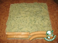 Уложить вафельный корж (или лист лаваша), обильно смазать его горячим картофелем, выложить с краю сосиски в ряд ( обычные по одной, у меня были очень тоненькие, я взяла по две). |